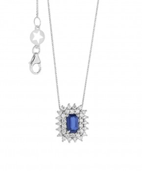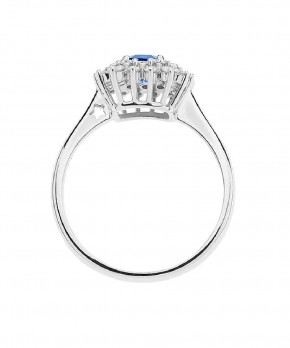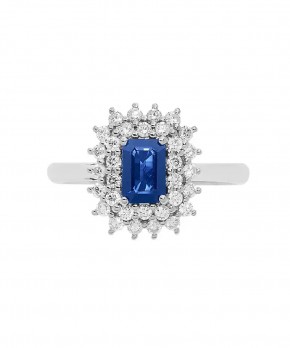 Anello Donna in oro bianco 750 impreziosito da diamanti bianchi e zaffiro blu. Diamanti bianchi P.Ct. 41, colore G, purezza SI e taglio brillante. Taglio zaffiro: ottagonale 4 x 6 mm, peso per singola pietra: CT 0.75. Misura anello: 13.5.
