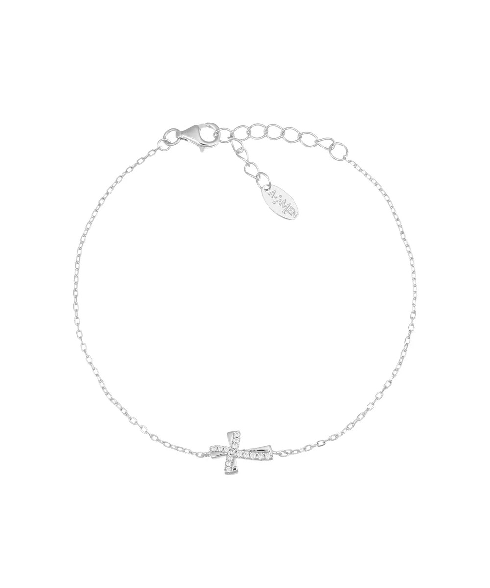 Bracciale in argento 925 con elemento centrale a forma di croce leggermente ondulata, impreziosita da zirconi bianchi. Lunghezza regolabile da 16 a 19 cm