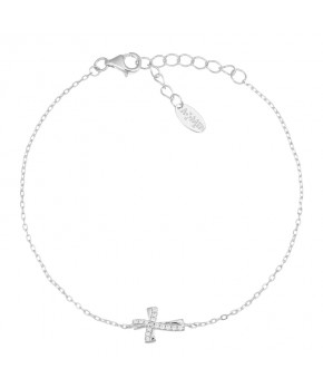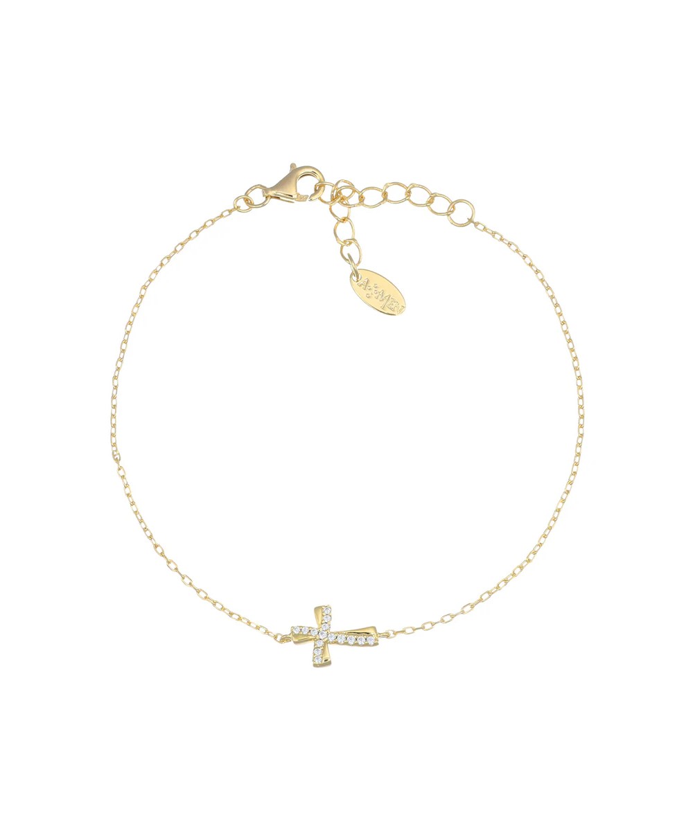 Bracciale in argento 925 dorato con elemento centrale a forma di croce leggermente ondulata, impreziosita da zirconi bianchi. Lunghezza regolabile da 16 a 19 cm