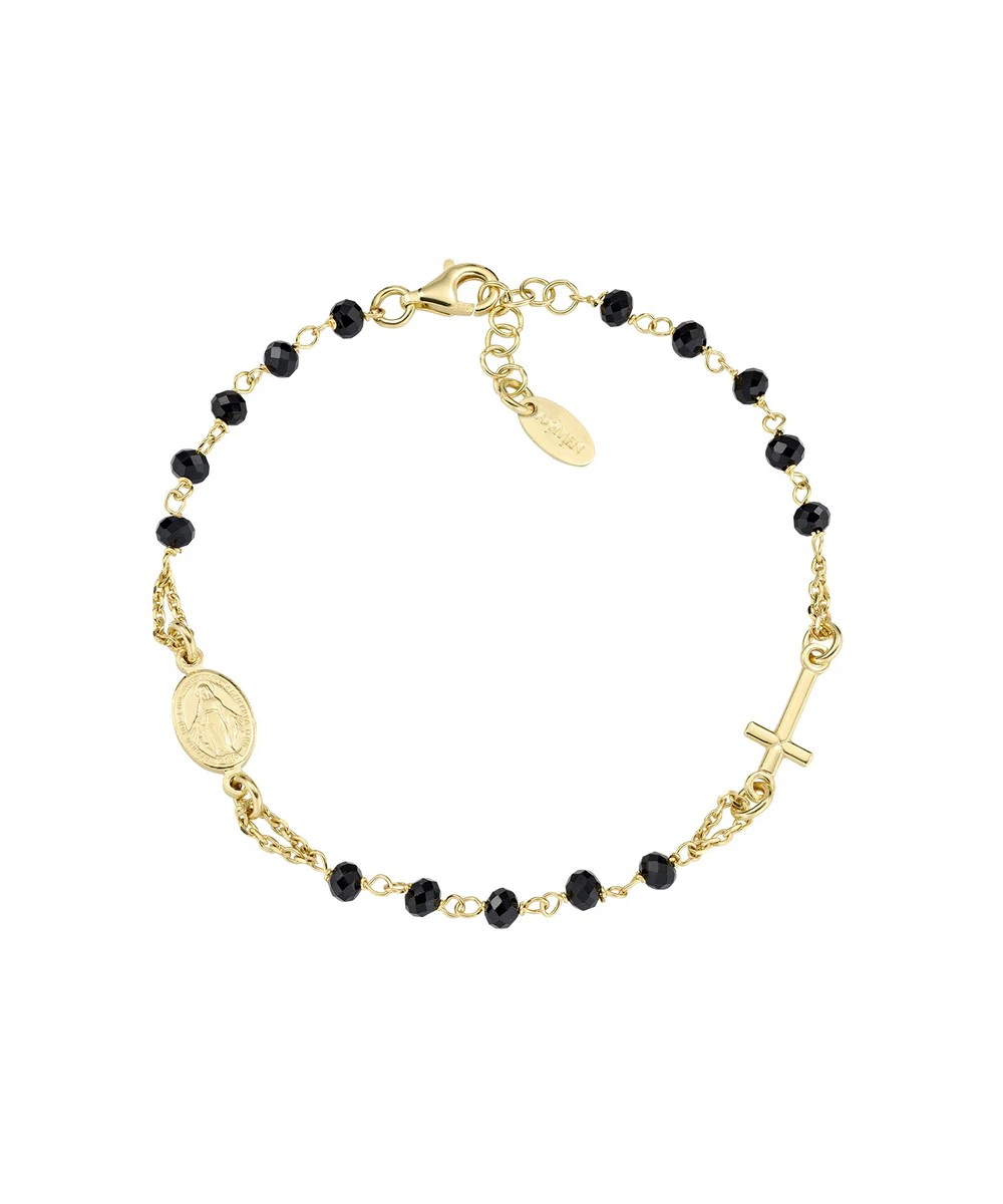 Bracciale in argento 925 dorato con grani neri da 3 mm sfaccettati, elementi a forma di croce e medaglietta. Lunghezza regolabile da 18 a 20 cm