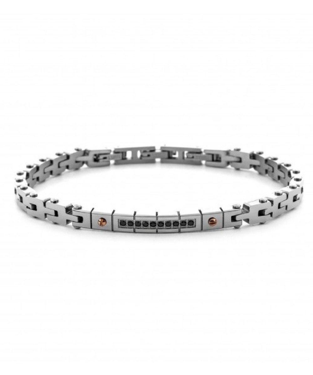 Bracciale Uomo in acciaio 316L con dettagli rosegold, elementi centrali impreziositi da zirconi neri. Lunghezza regolabile da 18 a 22 cm.