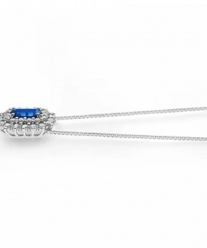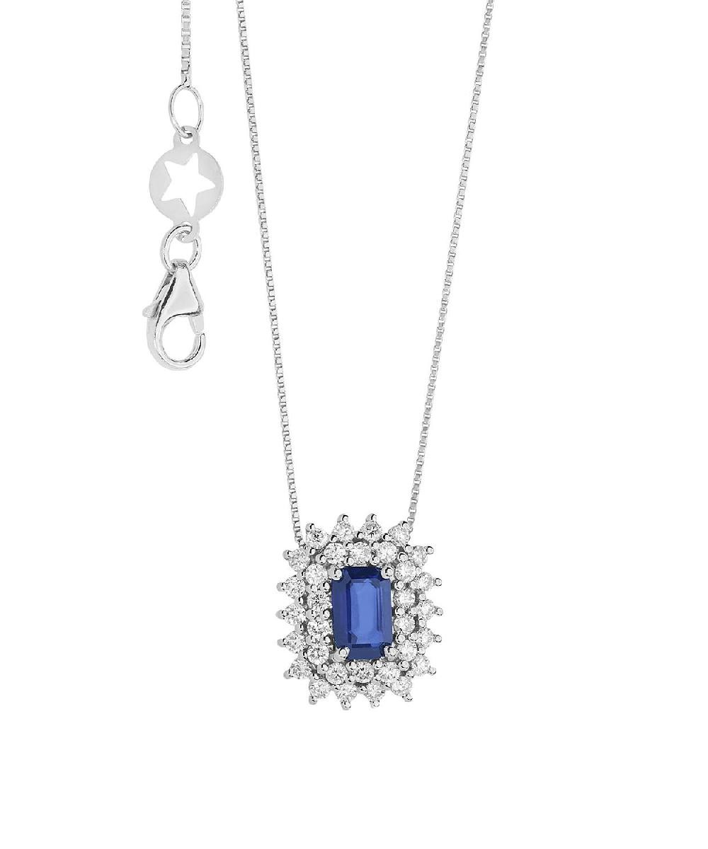 Collana girocollo Donna in oro bianco 750 impreziosita da diamanti bianchi e zaffiro blu. Diamanti bianchi P.Ct. 41, colore G, purezza SI e taglio brillante. Taglio zaffiro blu: ottagonale 4 x 6 mm, peso: CT 0.75. Lunghezza collana: 42 cm.