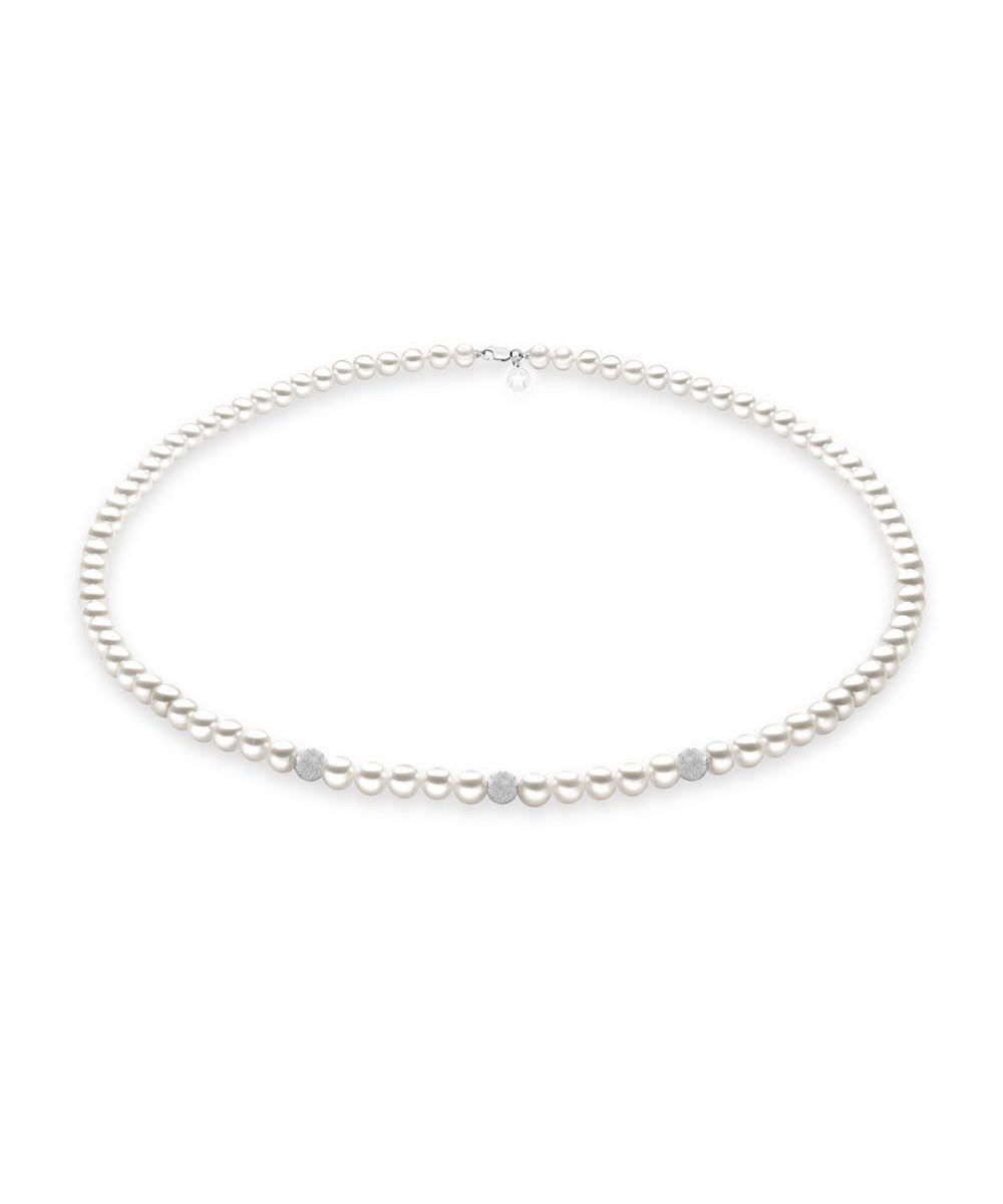 Collana Donna in oro bianco 750 con filo di perle coltivate di acqua dolce di Ø 4/4,5 mm e sfere in oro 750 con lavorazione diamantata, lunghezza: 42 cm.