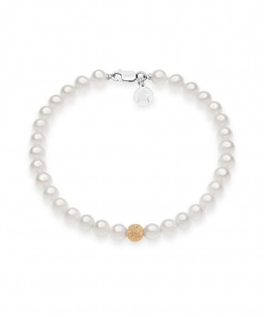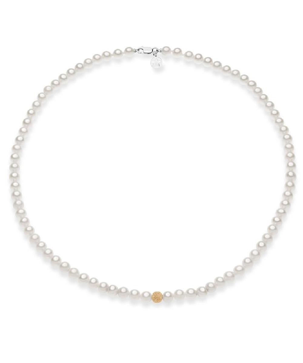 Collana Donna girocollo in oro bianco 750 con filo di perle coltivate di acqua dolce Ø 5/5,5 mm e sfera in oro rosé 750 con lavorazione diamantata, lunghezza: 42 cm.