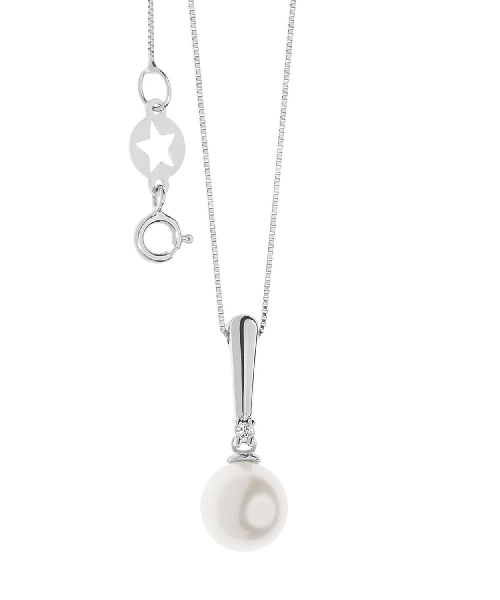 Collana Donna girocollo in oro bianco 750 con perla coltivata di acqua dolce Ø 6/6.5 mm. Diamante bianco P.Ct. 1, colore G, purezza SI e taglio brillante. Lunghezza collana: 42 cm.