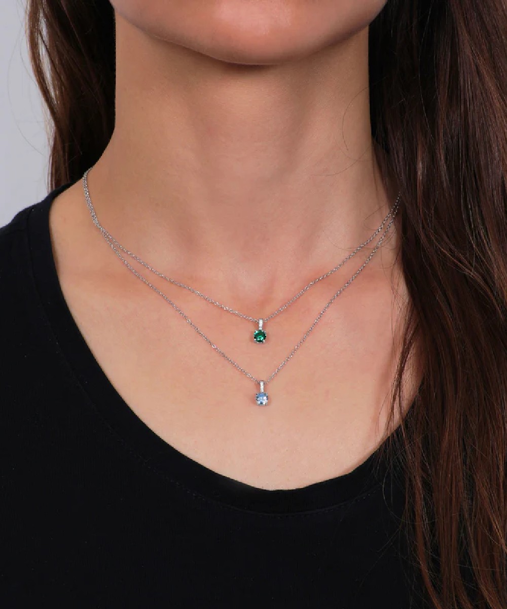 Collana Donna in argento 925 e pendente con punto luce in zircone acquamarina impreziosito da zirconi bianchi. Lunghezza regolabile da 40 a 45 cm.