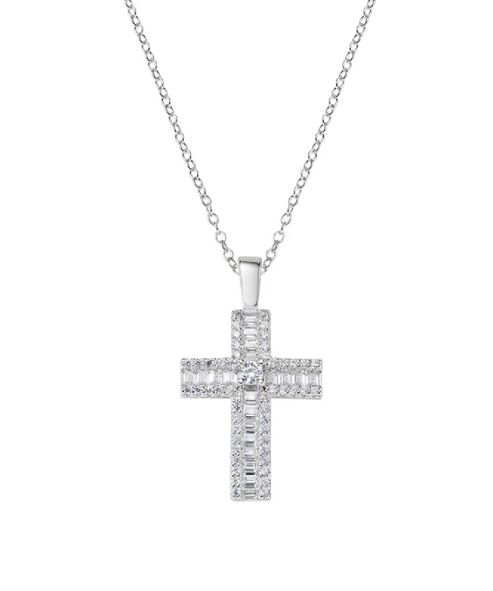 Collana Donna in argento 925 con pendente a forma di croce, con zirconi taglio baguette e pavè di zirconi bianchi. Lunghezza regolabile da 40 a 45 cm.