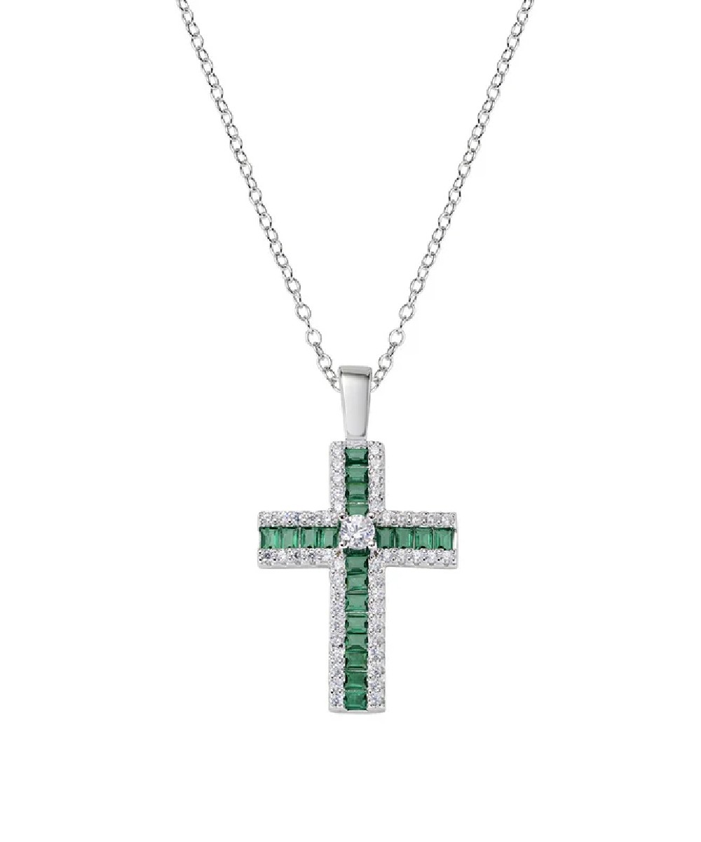Collana Donna in argento 925 con pendente a forma di croce, con zirconi verdi taglio baguette e pavè di zirconi bianchi. Lunghezza regolabile da 40 a 45 cm.
