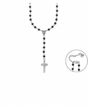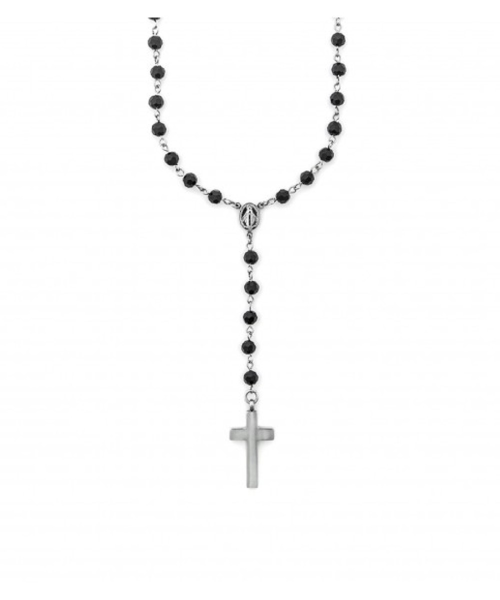 Collana Uomo Rosario in acciaio 316L con croce pendente e grani neri. Lunghezza regolabile da 60 a 65 cm.