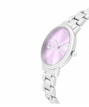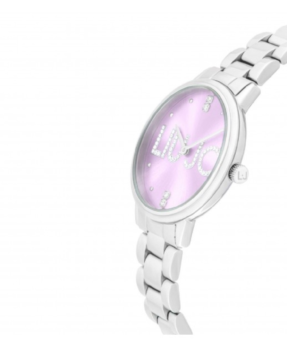 Orologio Donna solo tempo con cinturino in acciaio 316L colore silver. Cassa rotonda in acciaio 316L colore silver, diametro: 32 mm. Quadrante lilla impreziosito da cristalli bianchi con logo, sfere (lancette) colore silver. Resistenza all'acqua: 3 ATM. Movimento: al quarzo Seiko VJ20. Bracciale in acciaio abbinato.